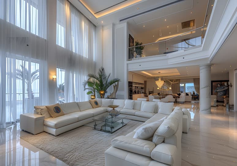 Pillar is a luxury to the resilience, adaptability, Spacious modern villa living room with centrally placed swimming pool blending indooroutdoor.